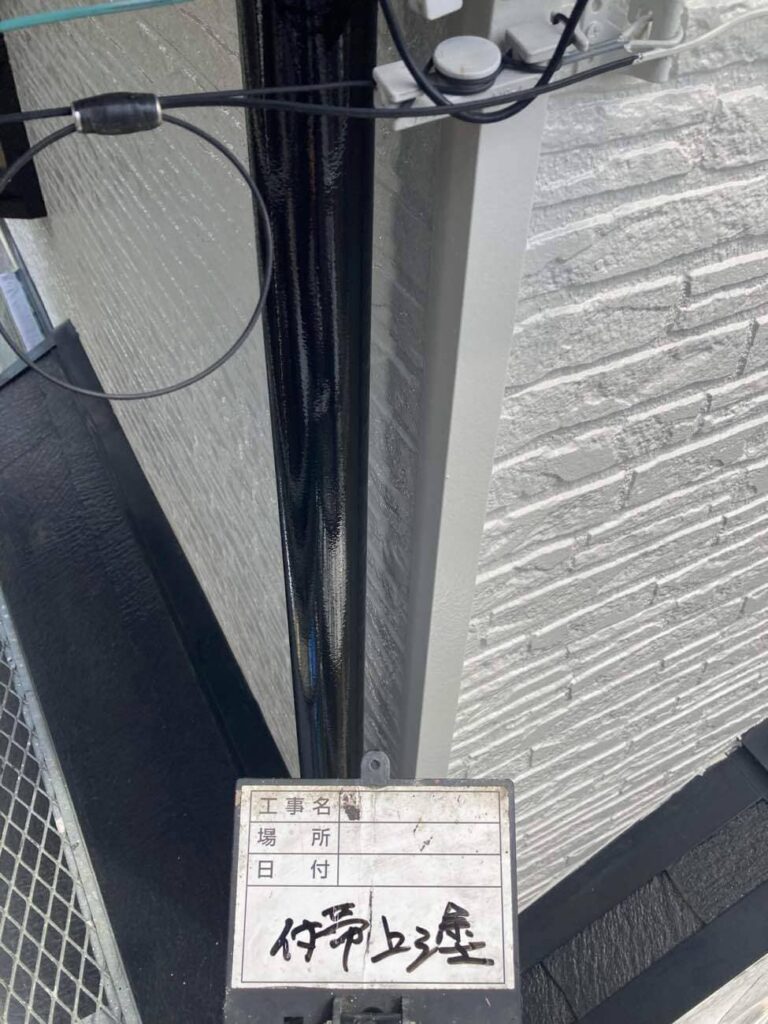• 付帯部の雨樋なども塗っていきます。テカテカー!