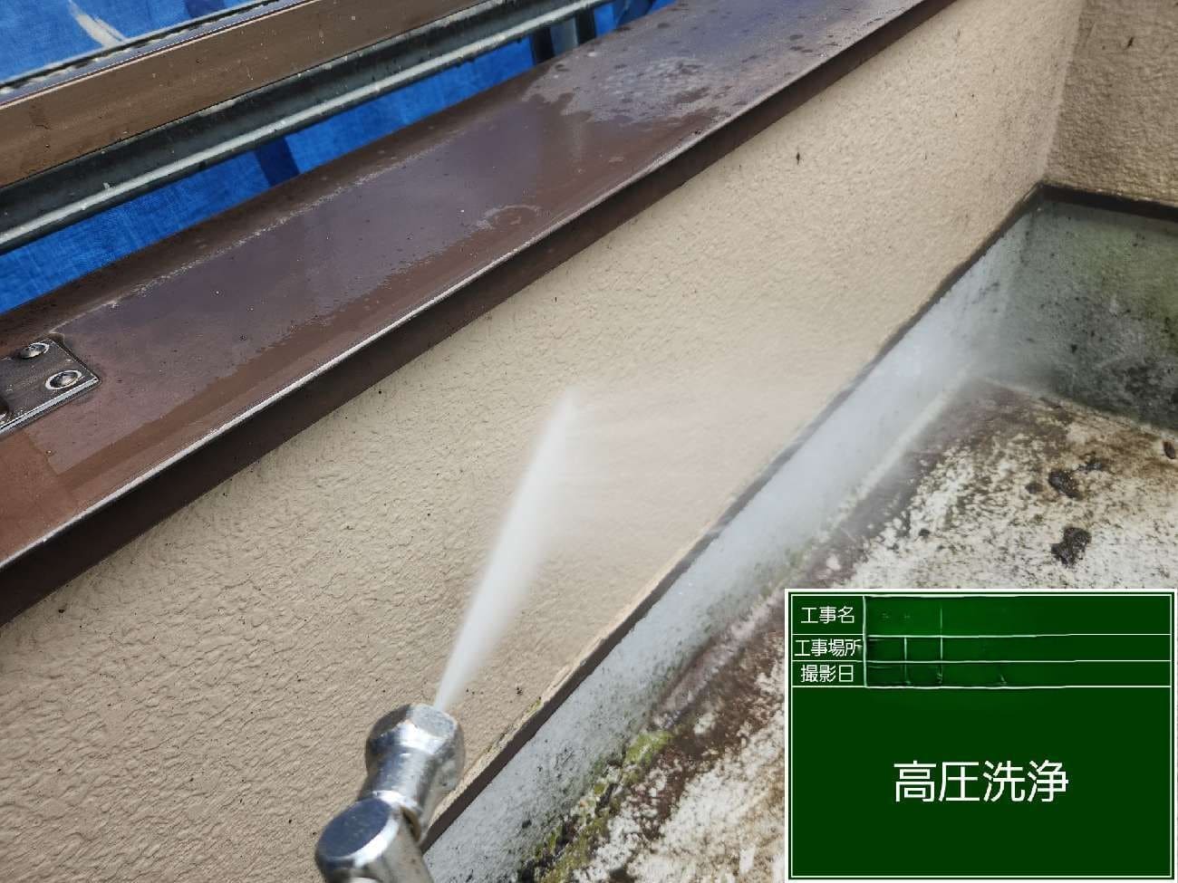 高圧洗浄です。埃や苔など長年の汚れを落としていきます!
