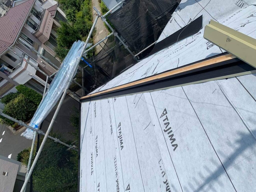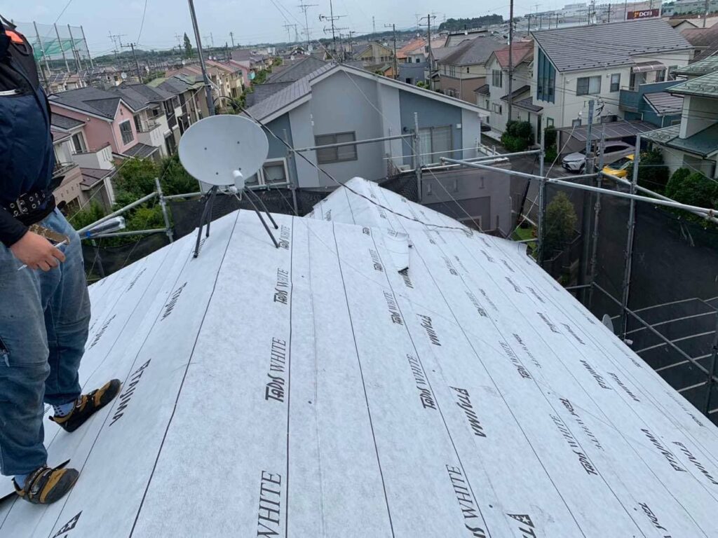 屋根に凹凸が無くなったらルーフィングをしていきます。雨漏れ対策になります!