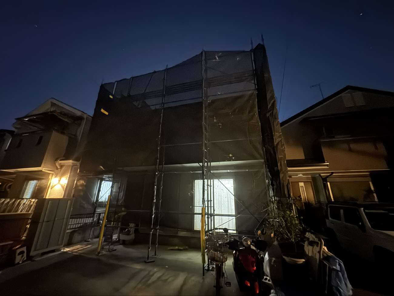 • 仮設足場設置。冬は日が暮れるのが速いので時間との勝負ですね。