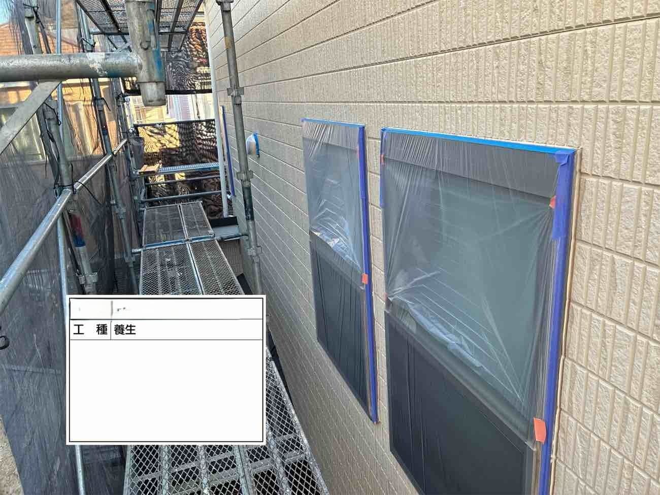 • 養生作業になります。ペンキがつかないように綺麗に貼っていきます。